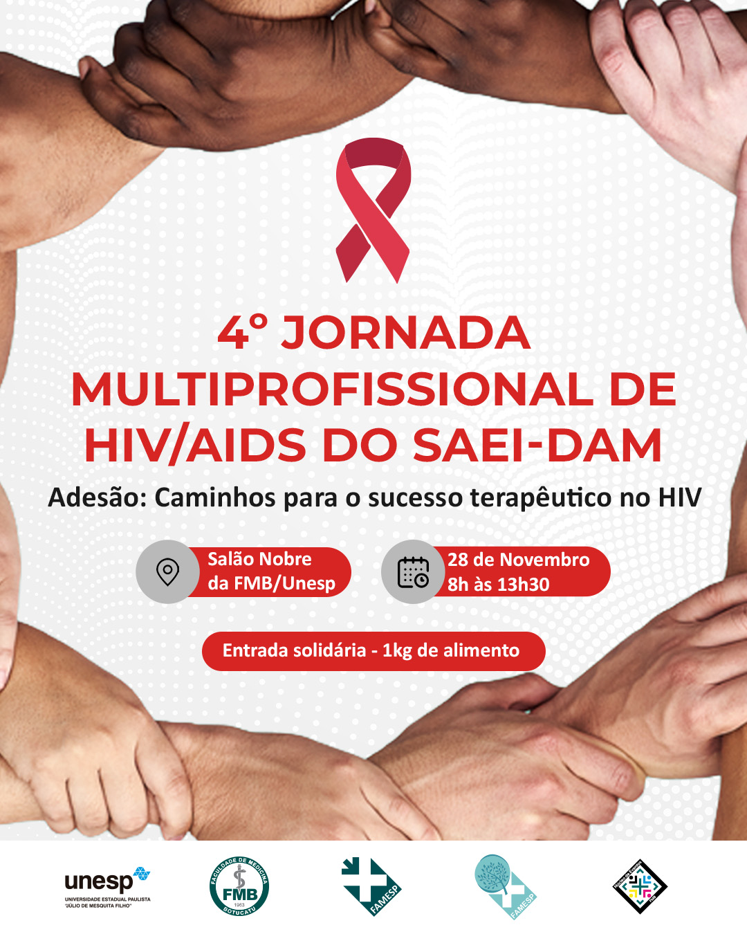 É com grande satisfação que convidamos todos e todas para a quarta edição da Jornada Multiprofissional de HIV/Aids do SAEI/DAM, que será realizada no dia 28 de novembro de 2025, das 08h às 13h30, no Salão Nobre da Faculdade de Medicina de Botucatu - UNESP.
