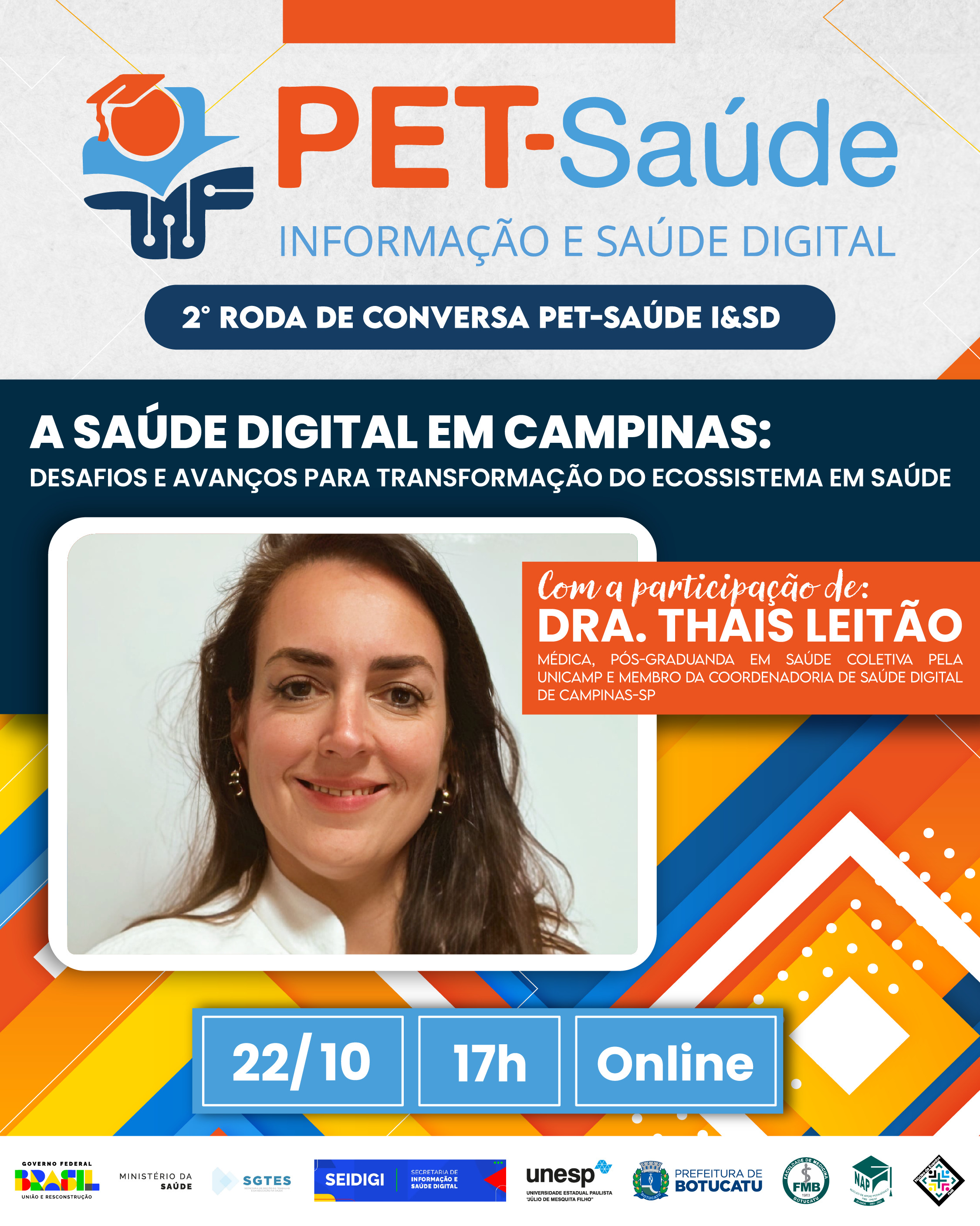 Convidamos você a participar da 2ª Roda de Conversa PET-Saúde I&SD com o tema: ''A Saúde Digital em Campinas: Desafios e Avanços para Transformação do Ecossistema em Saúde''.