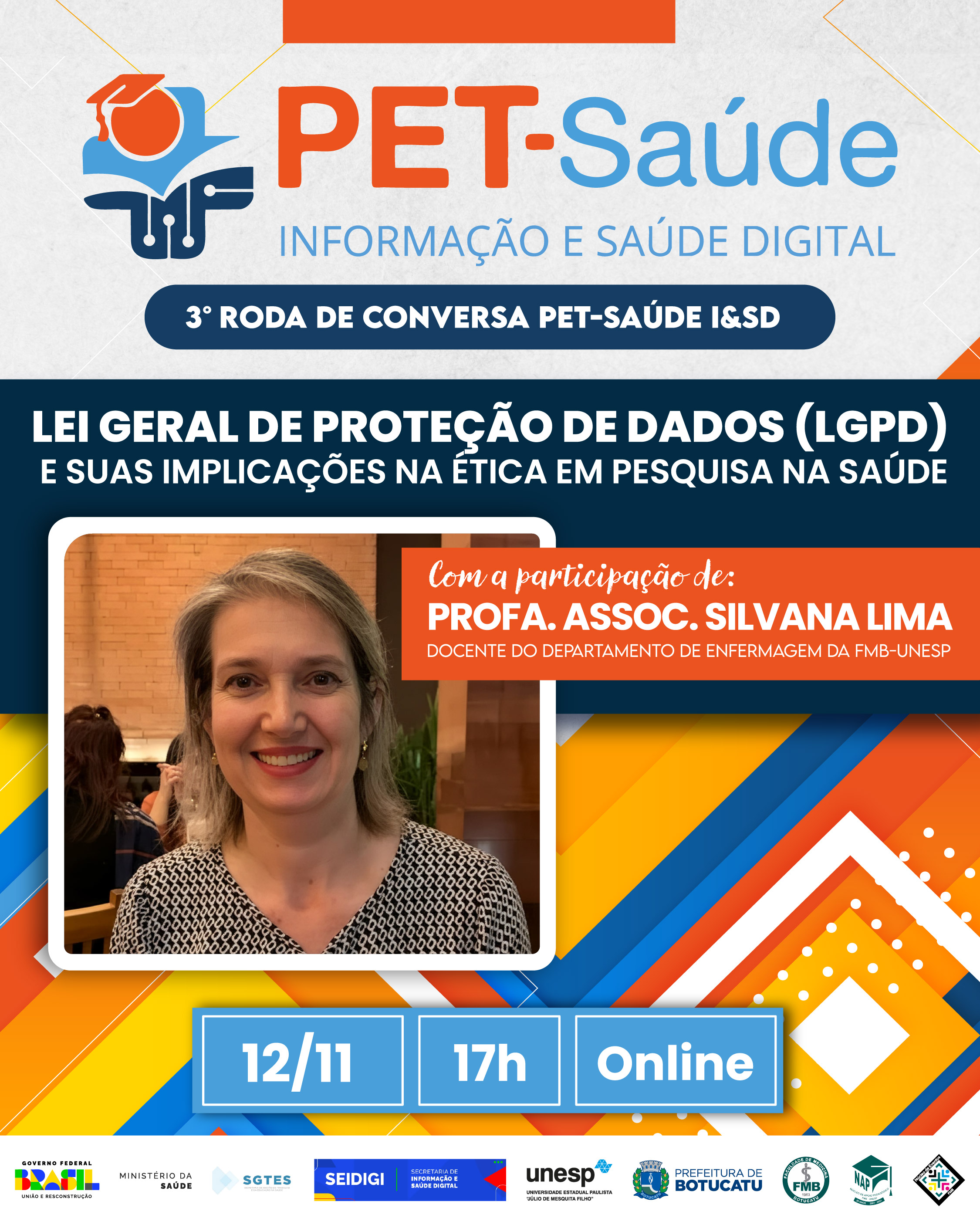 O PET-Saúde Informação e Saúde Digital o(a) convida a uma roda de conversa sobre a Lei Geral de Proteção de Dados (LGPD) e suas implicações na pesquisa na área da Saúde. O evento contará com a participação da Profa. Assoc. Silvana Andrea Molina Lima da FMB-Unesp. |