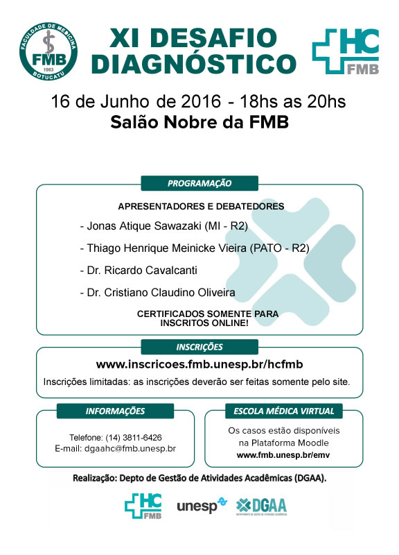 O Departamento de Gestão de Atividades Acadêmicas (DGAA) do Hospital das Clínicas da Faculdade de Medicina tem o prazer de convidar V.Sa. para o XI Desafio Diagnóstico, que ocorrerá no próximo dia 16 de junho de 2016, às 18 horas, no Salão Nobre da FMB.